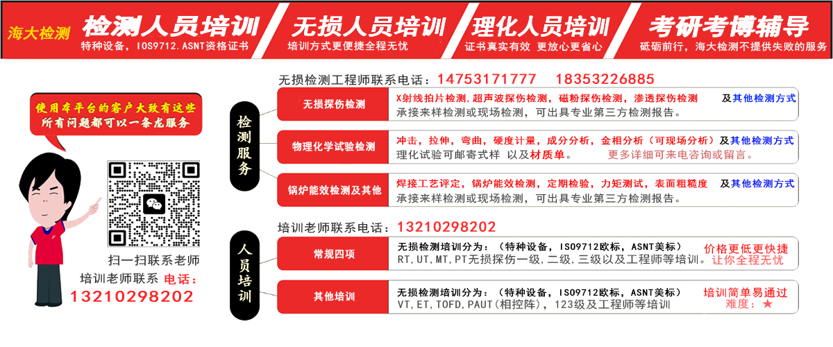 无损检测咨询服务,无损检测培训,质监局无损检测培训,美标无损检测培训,ASNT培训,美标相控阵培训,美标TOFD培训,欧标无损检测培训,ISO9712无损培训,欧标相控阵培训,欧标TOFD培训,理化实验人员培训,金相检测培训,材料成分培训,材料力学性能培训,超声波培训,磁粉培训,渗透培训,射线培训,焊接工艺评定培训